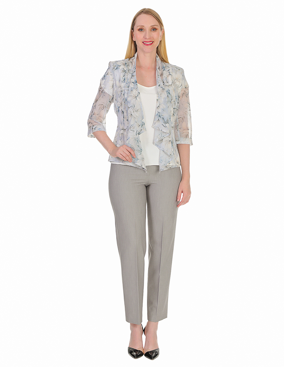 Blazer estampado floral azul y beige de manga 3/4 combinado con pantalón gris ejecutivo. El blazer presenta un delicado estampado floral en tonos azul y beige que aporta feminidad y frescura sin perder profesionalismo. Diseño abierto sin botones que permite versatilidad en el styling. El pantalón gris de corte recto proporciona una base neutra perfecta. Ideal para reuniones creativas, eventos corporativos de primavera/verano y ocasiones que requieren un look profesional con toque distintivo y fresco.