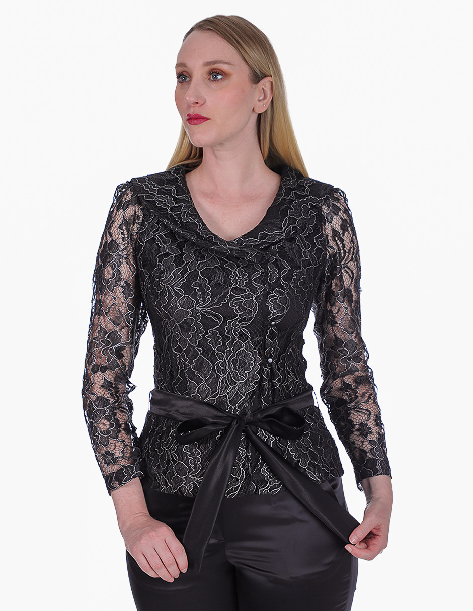Blusa de encaje negro con mangas largas transparentes y cinturón satinado que realza la silueta. Presenta cuello en V elegante y diseño de encaje floral que combina feminidad con profesionalismo sofisticado. El cinturón satinado aporta un toque luxe al conjunto. Ideal para eventos corporativos especiales, cenas de negocios importantes y ocasiones que requieren equilibrio perfecto entre elegancia y autoridad ejecutiva. Perfecta para ejecutivas que buscan destacar con clase refinada.