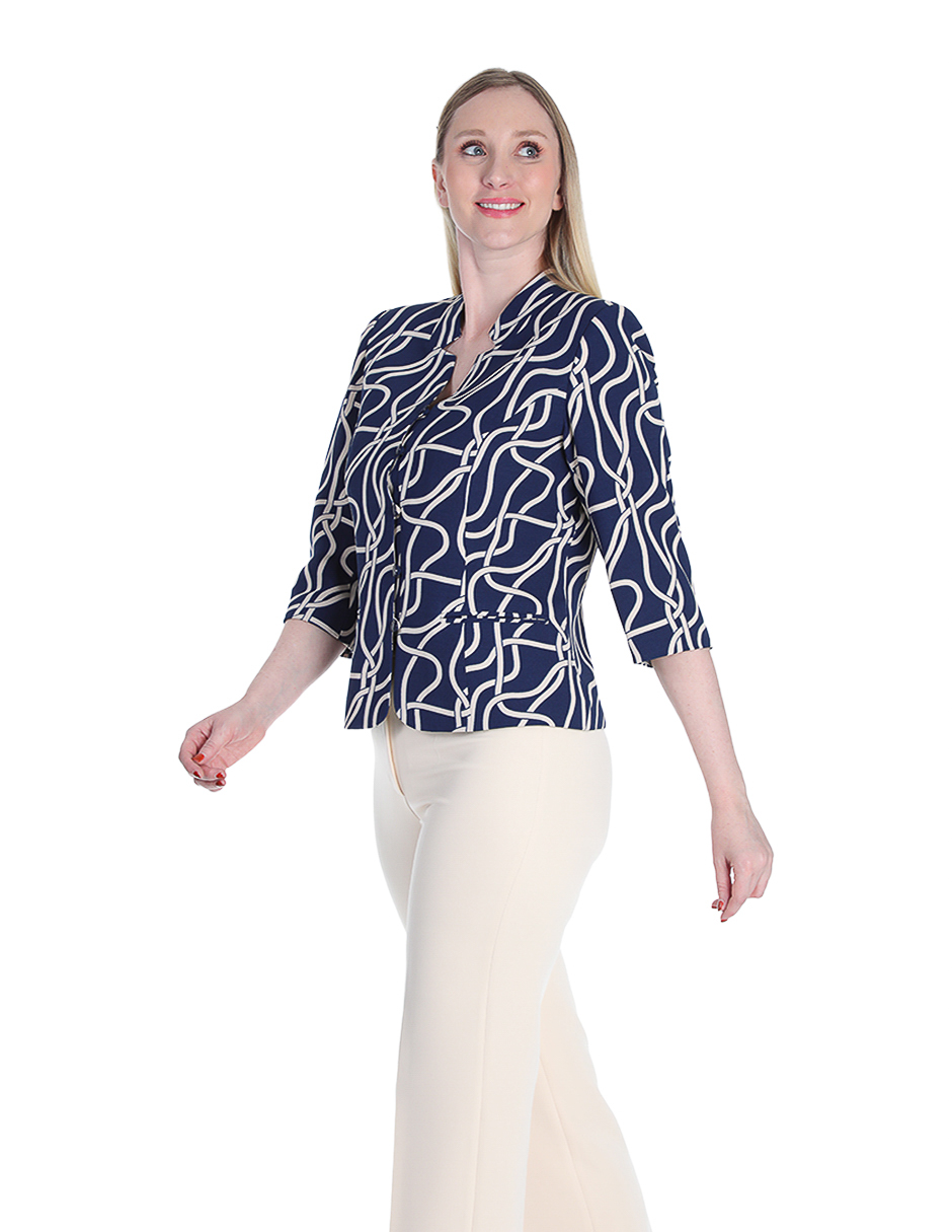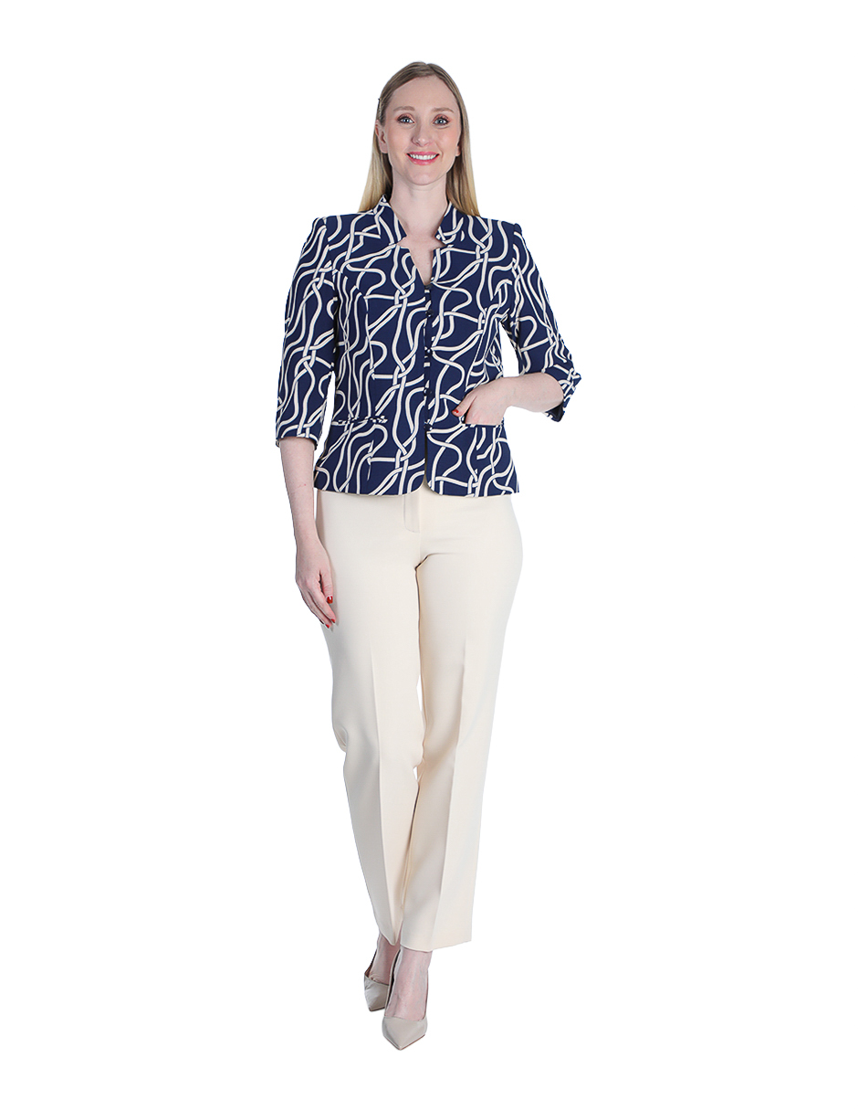Blazer azul marino con estampado geométrico beige y pantalón marfil.
