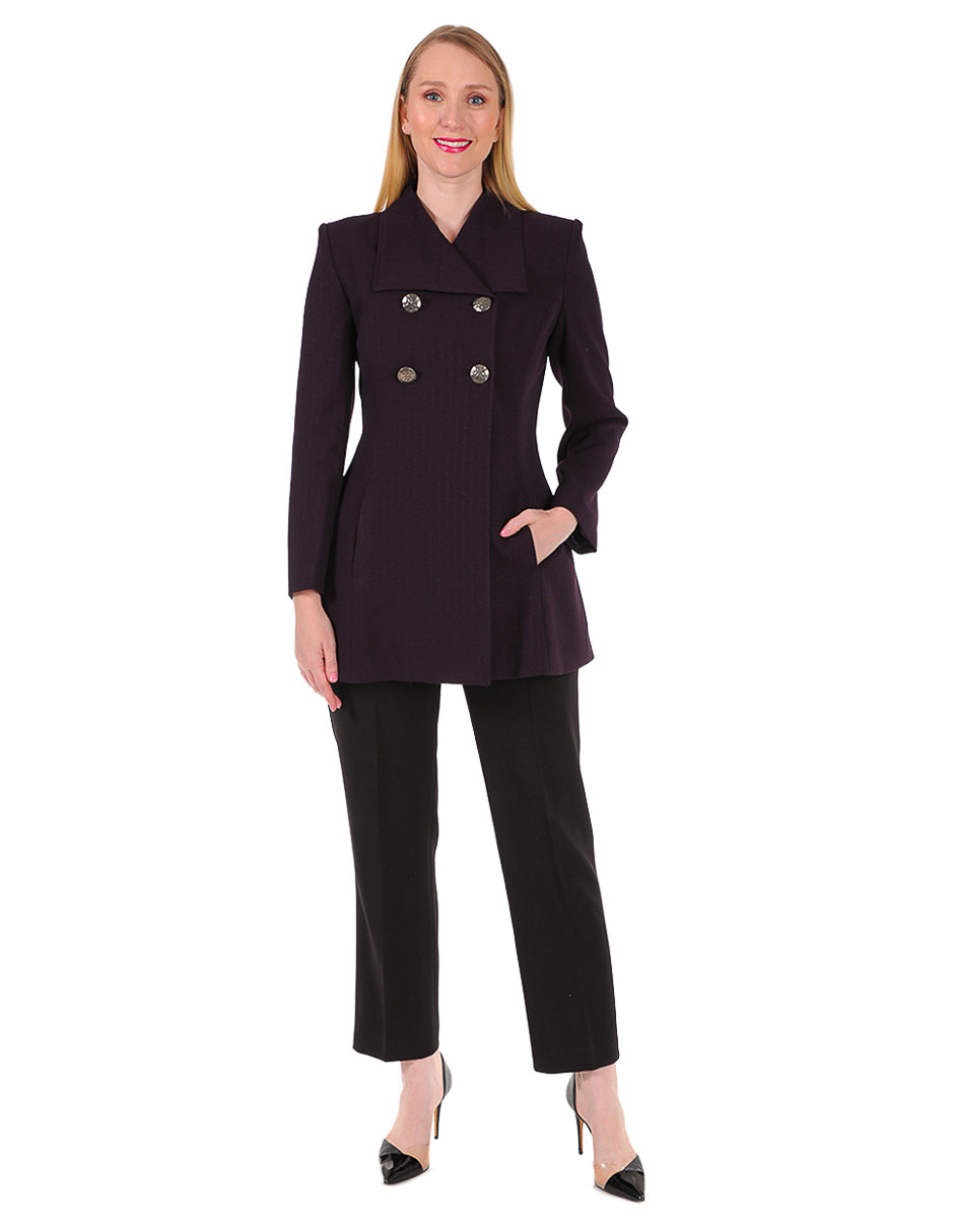 Abrigo largo negro estilo militar con botones metálicos y pantalón negro a juego. El abrigo presenta diseño estructurado con doble botonadura que proyecta autoridad inmediata y elegancia sofisticada. Longitud extendida que aporta presencia imponente ideal para ejecutivas en posiciones de alto liderazgo. Perfecto para reuniones de directorio, eventos corporativos formales y ocasiones que requieren máximo impacto visual y presencia ejecutiva dominante. La construcción premium asegura durabilidad y mantenimiento de forma en uso frecuente.