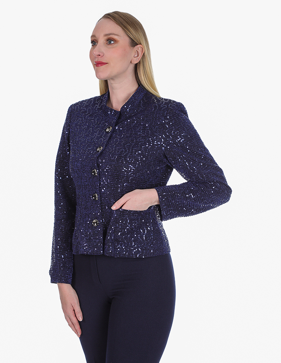 Blazer ejecutivo azul marino con lentejuelas brillantes que aportan glamour profesional. Diseño de múltiples botones frontales y construcción estructurada que favorece la silueta. Ideal para eventos corporativos especiales, cenas de negocios y ocasiones que requieren destacar con elegancia y autoridad. Las lentejuelas crean un efecto de brillo sutil pero impactante, perfecto para ejecutivas que buscan proyectar confianza y sofisticación en entornos de alto nivel.