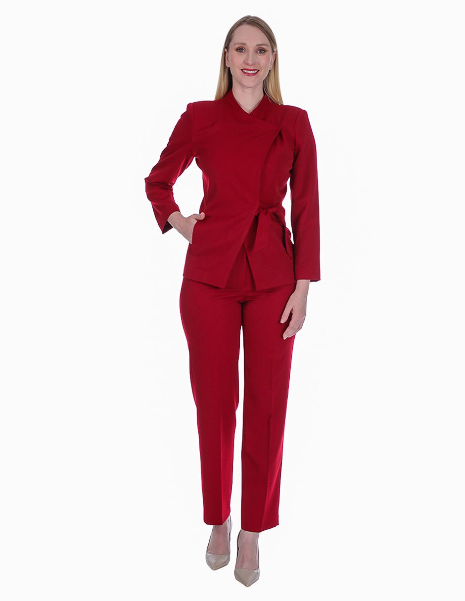 Traje ejecutivo rojo completo de chaqueta cruzada con cinturón y pantalón a juego. La chaqueta presenta diseño wrap con cinturón que define la cintura y crea una silueta favorecedora. Cuello solapa clásico y botones frontales. El pantalón de corte recto complementa perfectamente el conjunto. Color rojo poderoso ideal para ejecutivas que buscan proyectar autoridad y confianza. Perfecto para presentaciones importantes, reuniones de alto nivel y eventos corporativos donde se requiere máximo impacto visual.