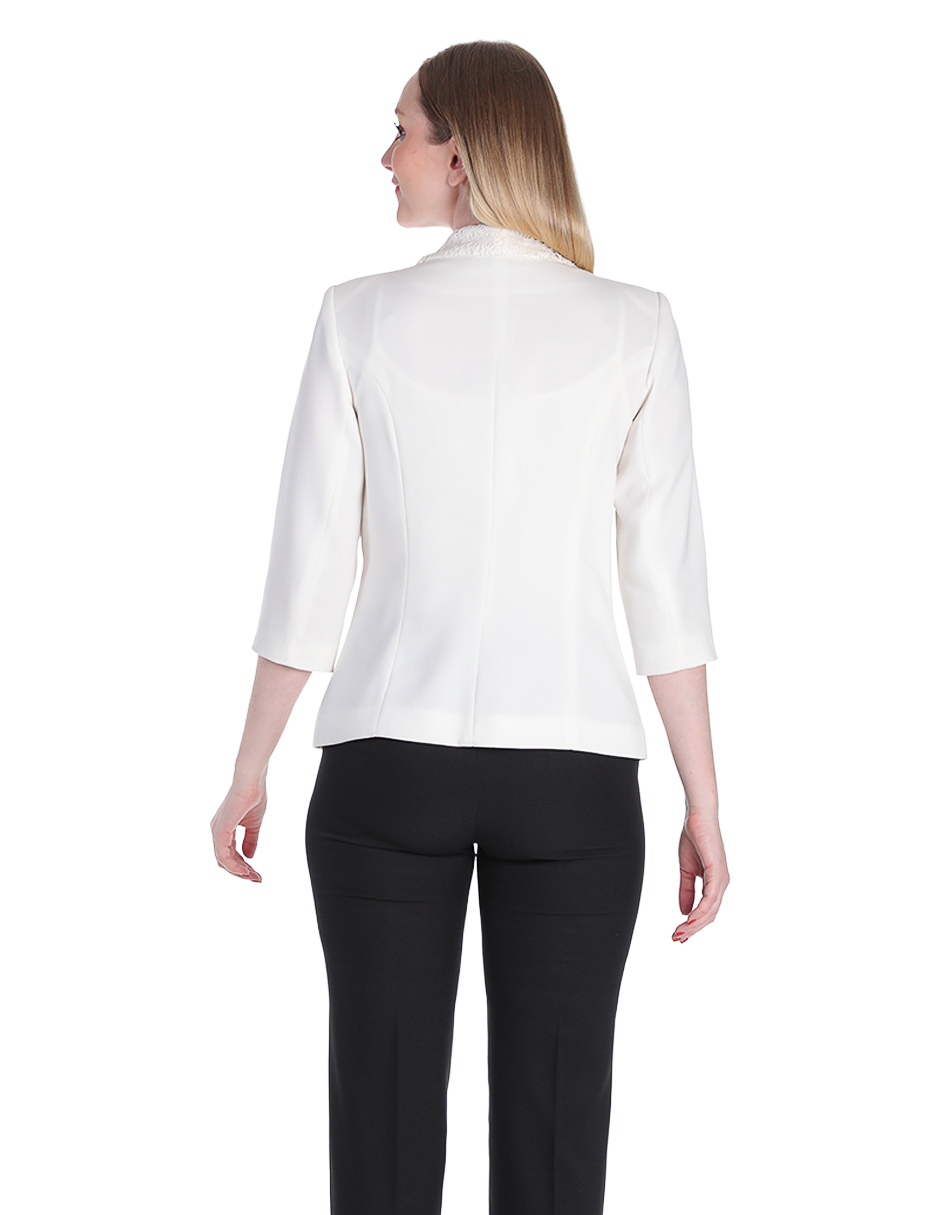 Blazer blanco con bufanda texturizada y pantalón negro.