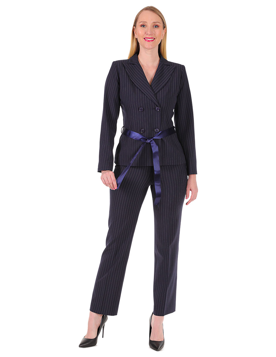 Conjunto ejecutivo de blazer azul marino cruzado con cinturón satinado y pantalón negro a juego. El blazer presenta diseño cruzado sofisticado con cinturón que define la silueta y crea línea favorecedora. Las rayas finas añaden textura sutil mientras el cinturón azul aporta elemento de distinción. Ideal para ejecutivas que buscan feminidad profesional con autoridad. Perfecto para reuniones importantes, presentaciones ejecutivas y eventos corporativos donde se requiere presencia poderosa con elegancia refinada.