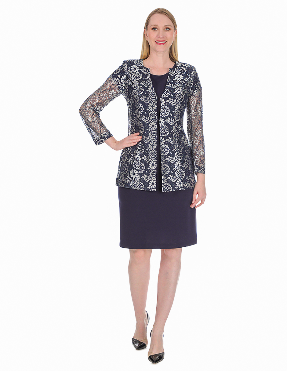 Conjunto ejecutivo en azul marino. Vestido recto a la rodilla con escote redondo y caída pulida. Saco abierto de encaje floral bicolor (marino/blanco), manga larga y vivos lisos que estilizan. Look cómodo y sofisticado para juntas, presentaciones y eventos corporativos. Combina con tacones negros o nude para un impacto sobrio.